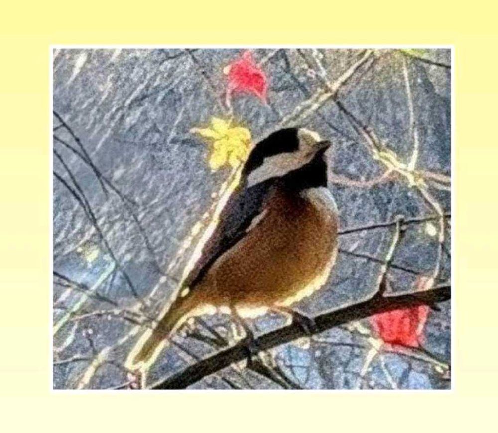 珍しく秋の名残りの赤黄色と色彩のある背景で撮れましたのでちょっと遊んでみました🖼️ 最近山雀さん冬に備えて貯食も忙しいし 沢山食べもして丸くなって来たような気がしていますよ〜🤭 コメントをありがとうございます