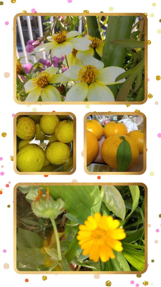 ウィンターコスモス、柚子の実、みかんの実、 金盞花の花