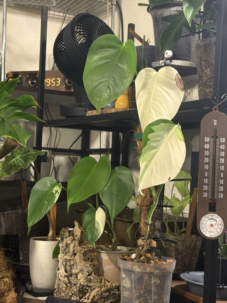 2025.8月に某サイトで購入した【アロカシア チャイ】の 突然変異?なんだろう 購入時、元々有った葉を(1枚目の葉)として、 下から新たな葉が出てきてる状態で到着しました(2枚目の葉) こちらに来て初めて出てきた葉に異変が。。 育て始めて出てきた初めての3枚目、4枚目 (途中から、斑1、斑2、、と続きます) どこまでこの謎の斑入葉が続くのか、 いや止まるのか……記録していきます