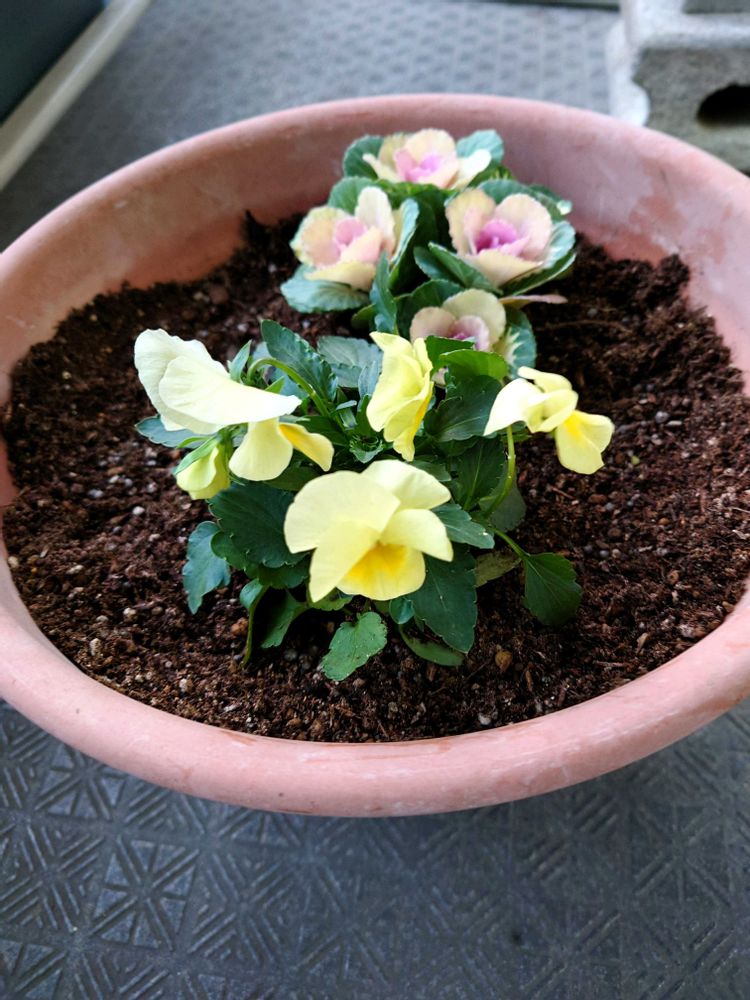 よく咲くスミレと葉牡丹を寄せ植えにしてみました