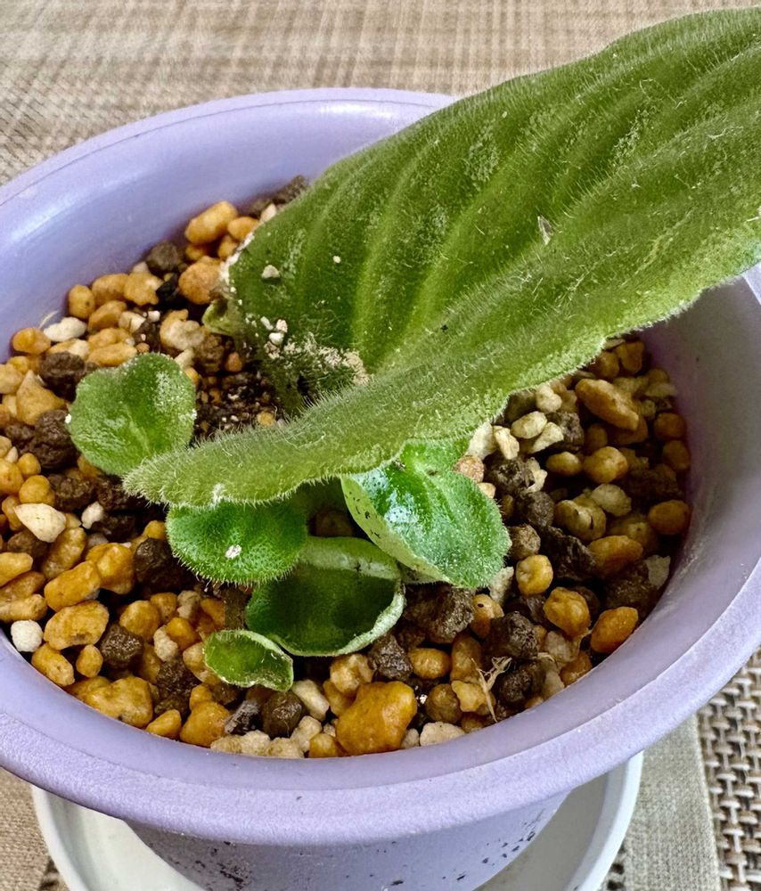 その葉の根元、茎の下から新芽🌱が出てきていました。小さなポット鉢に植え替えを。😀