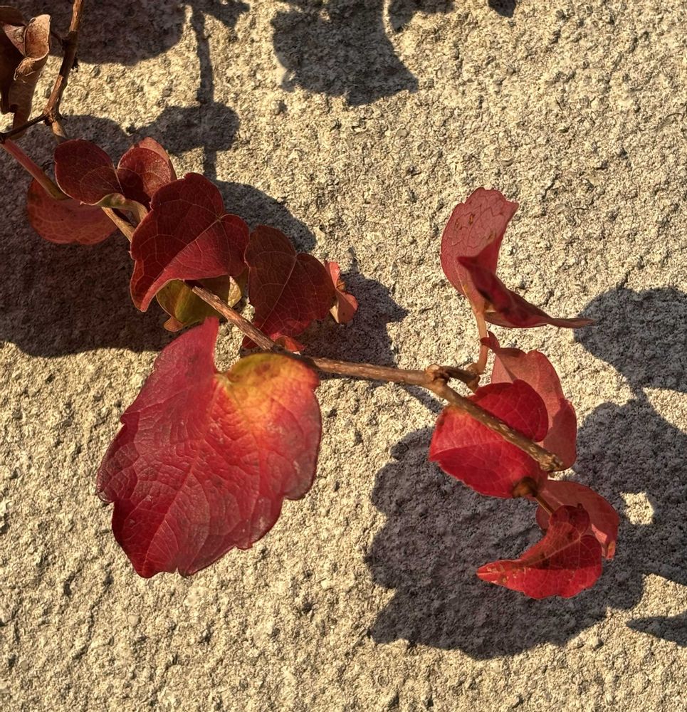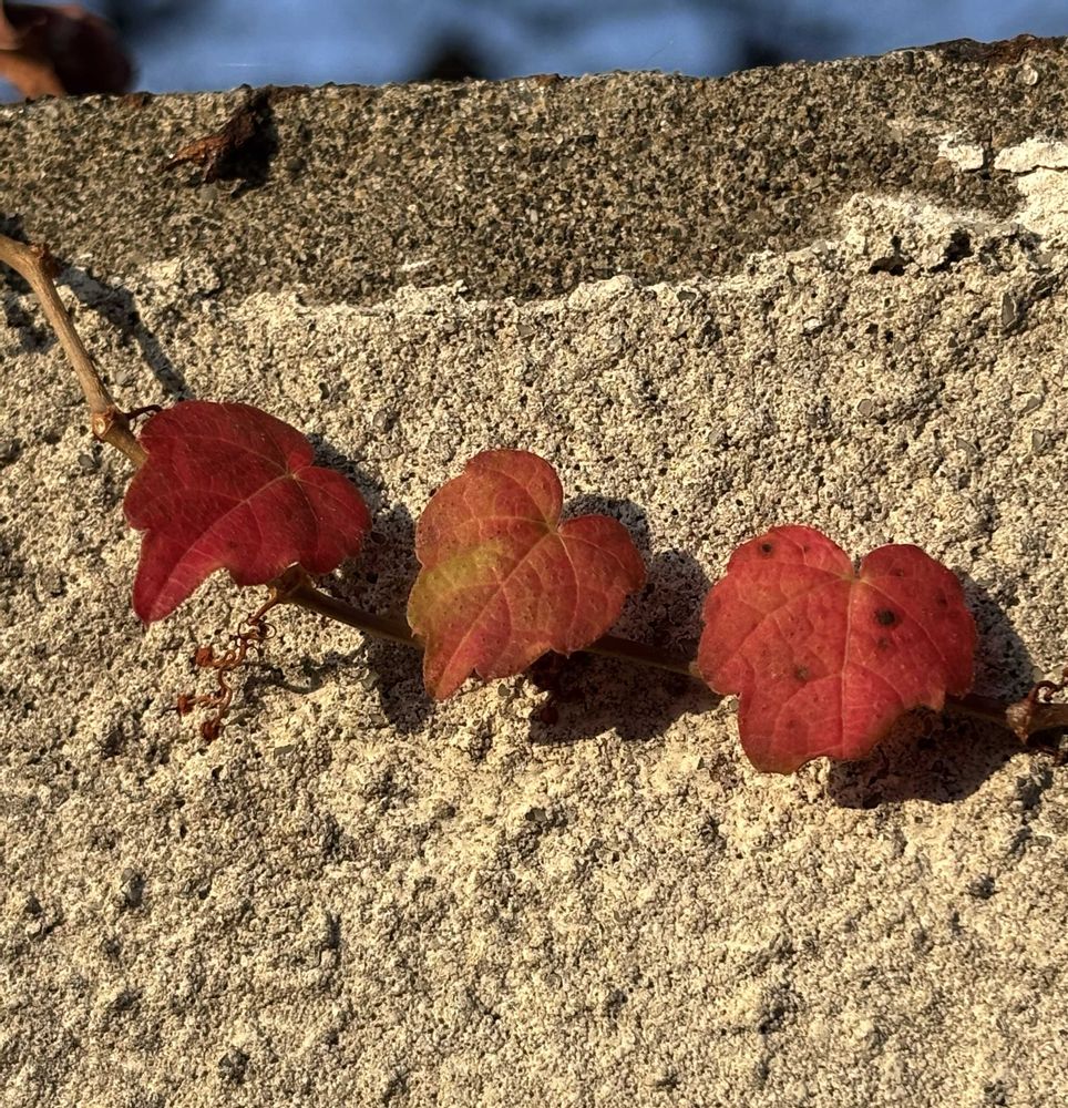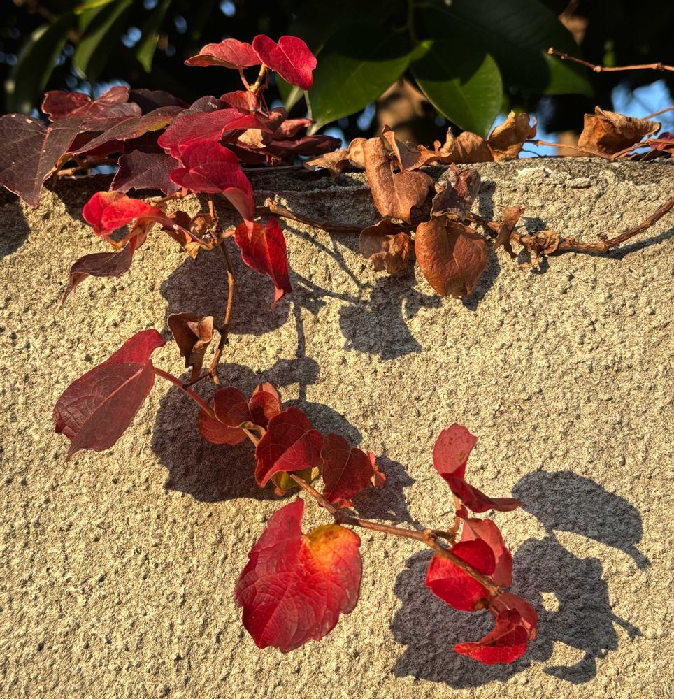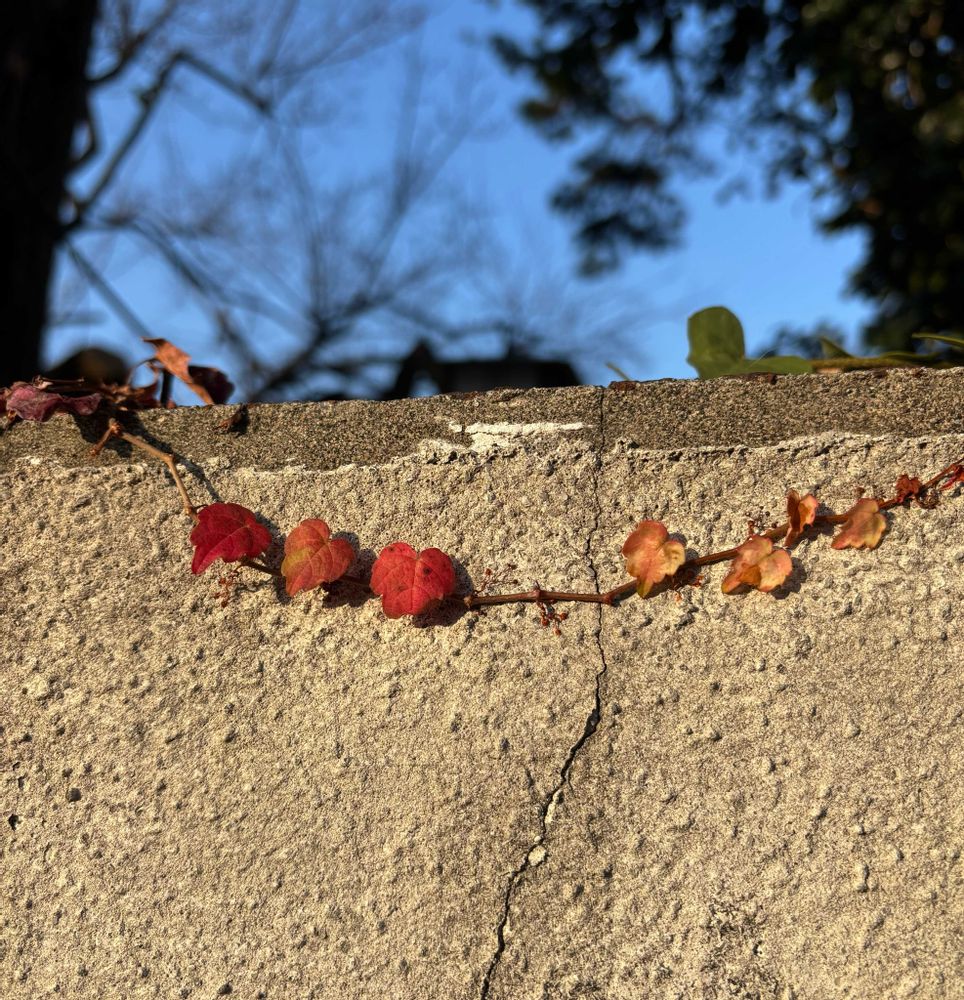 白く塗ったコンクリート塀が古くなって色がくすんだところにツタが這って、そして紅葉🍁に西日が当って、目を奪われました👀大家さんは、ツタを剥がしているようなんですが、少し残っていたんです。
