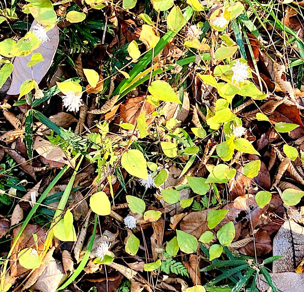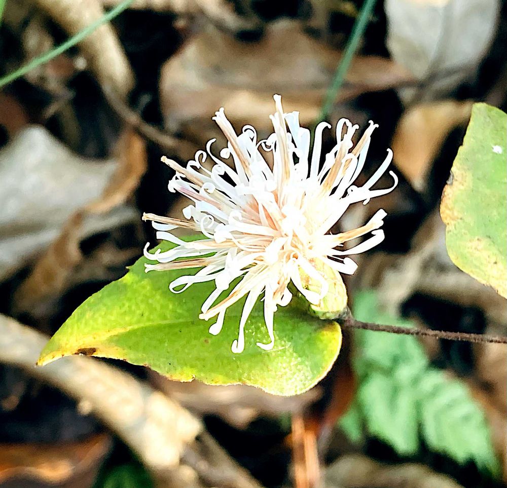 枯葉の敷き詰められた静かな林の中で、繊細な筒状の小さな白い花を密集させて咲いていた、「 高野箒(コウヤボウキ)」の花で、おはようございます🌿🤍🕊️✨