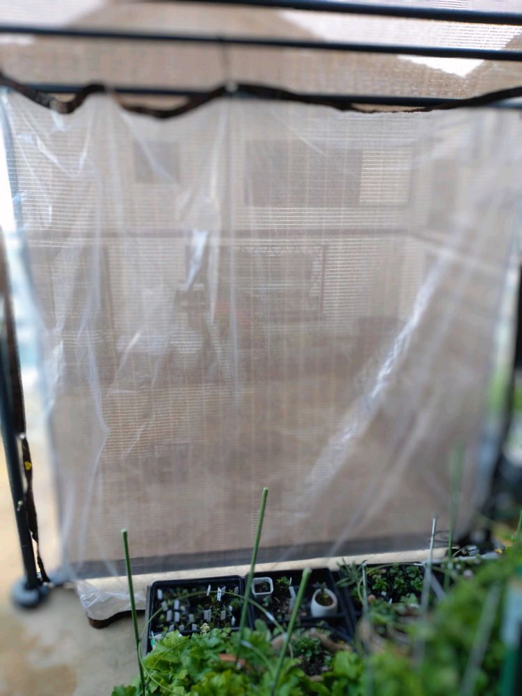 もっと寒くなってきたら、両脇にも取り付けて、シェードの枠の大きさごとハウスにするかも。