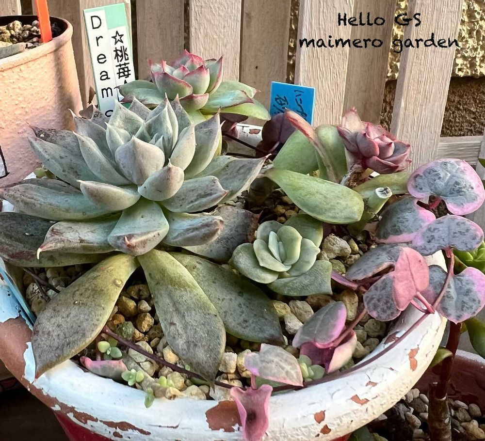 マイメロさんのハートカズラ斑入り《レディハート》,エケベリア クリスペートビューティー,寄せ植えの投稿画像