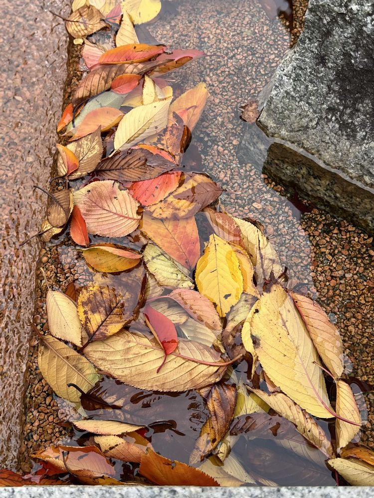 覚えてた!三角定規を彷彿とさせる初冬の落ち葉が水盤に溜まっていました。