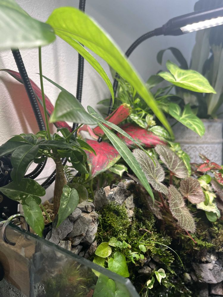 ダンナさんのアクアテラリウムは調子がいいです。タイマーで勝手にライトがオンオフになってるけど新芽もたくさん出てきて、弱々やった斑入りクワズイモの赤ちゃんもそっと植えてもらったら元気になりました。