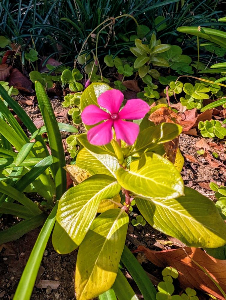秋の季節外れに咲いてた痩せた一輪のニチニチソウ。秋も深まると花が小さくなったり、株全体が弱々しくなったりする。別名:ニチニチカ(日日花)とも。