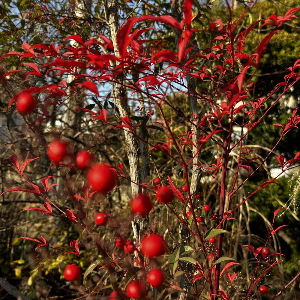 ①↙️②ナンテン赤い実は鳥に食べられるポツポツだけど真っ赤に紅葉した葉っぱが綺麗🍂🔴