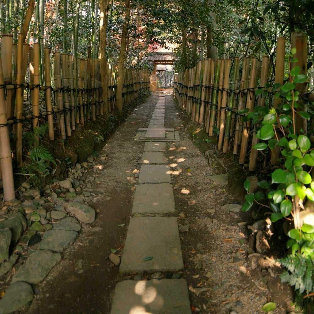 ①やっと看板に気づいたが、「えっ、この狭い路地が入口? まさかなぁ😨」と疑心暗鬼になりながら、②竹垣の小径を数十メートル歩いていくと、③厭離庵の小さな門🏕️