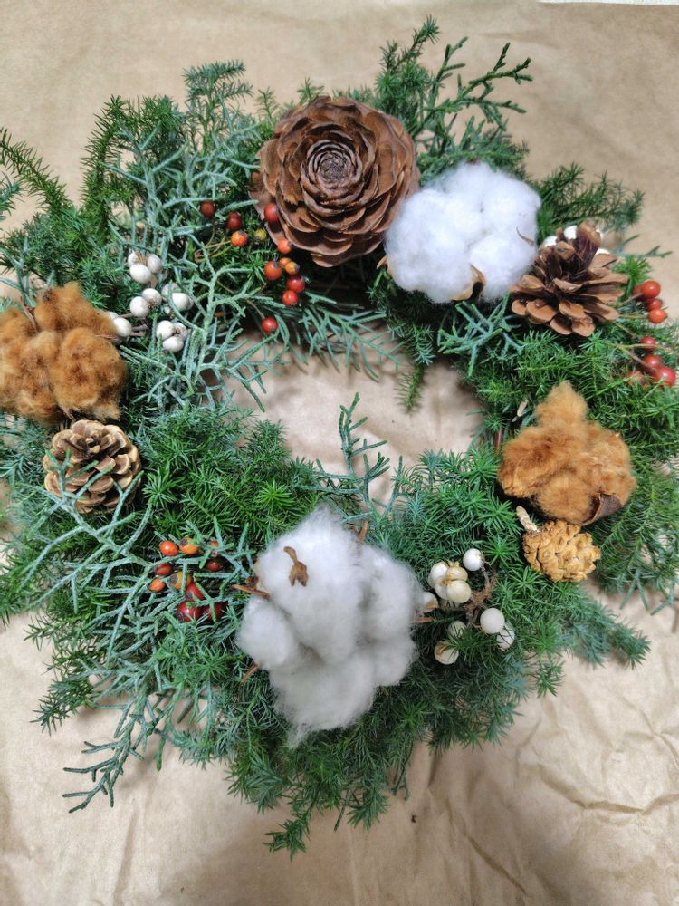 ヒムロスギ、グリーンアイスを一枝づつ購入してリース作り始めたけどギリギリ(笑)もう少しワシャワシャ作りたかったけど〜