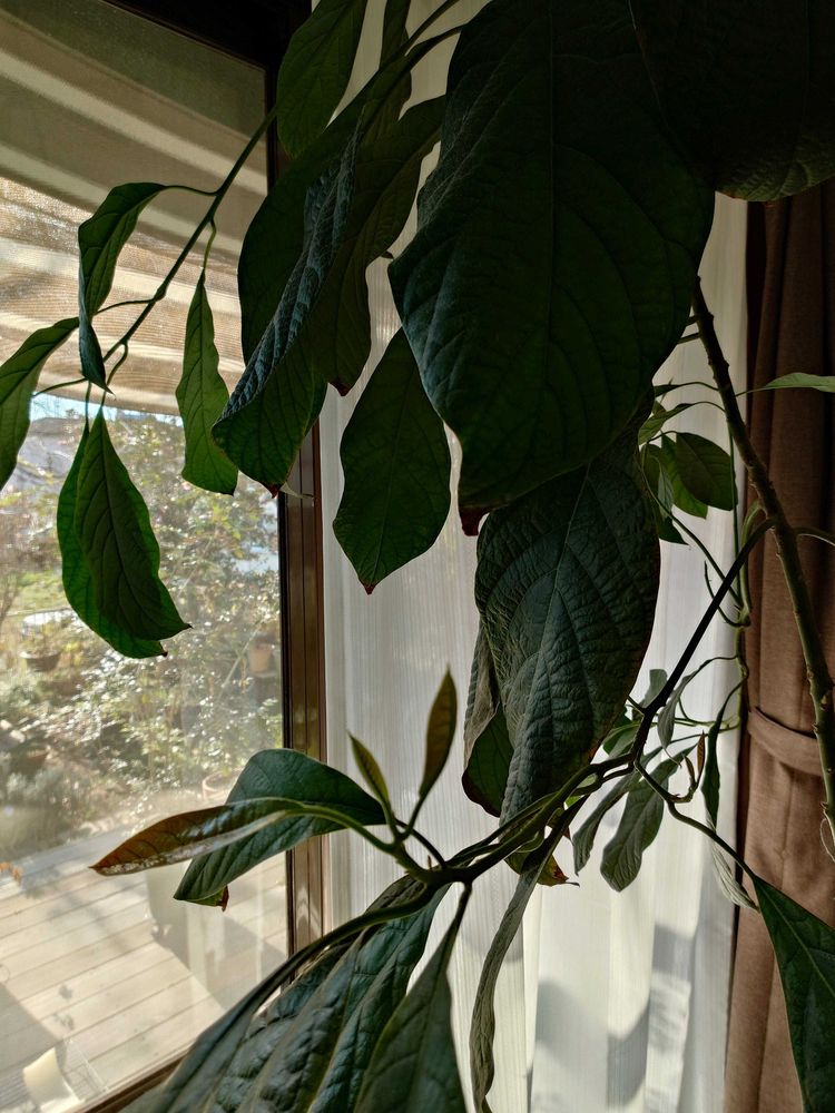 私のアボカドちゃん、玄関に入れましたが葉っぱがチリチリ黒ずんでます💦