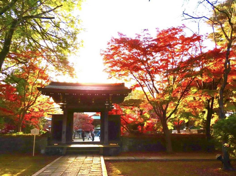 お寺の門と紅葉に午後の光があたり、