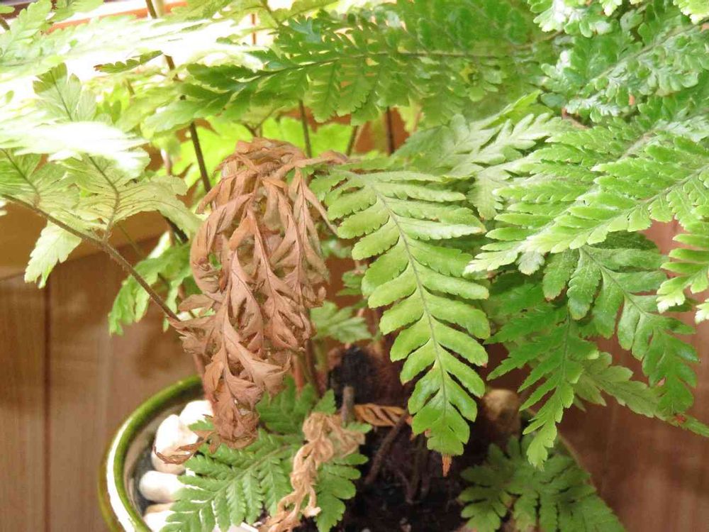 こんばんわ。これ、何を撮ってるかわかりますか? 観てのとおり、シダの葉ですけど、一本の枝葉が変な枯れ方をしてるんです。右半分は、まだ青々としてるのに、左半分は完全に枯れちゃってます。この現象って稀有だなぁって思って、写真撮りました。GS映え! ですよね。エモいですよね!。
