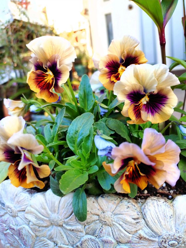 ふんわり優しいフリルでシックな色のパンジーは寄せ植えにしました(左端にリシマキア ボージョレ右端にナデシコ)