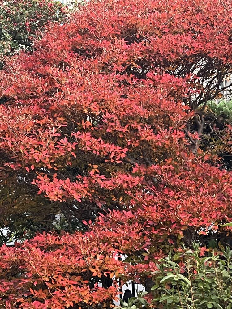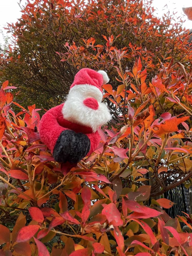 真っ赤なドウダンツツジの上でお手手をこすり合わせる🎅さん