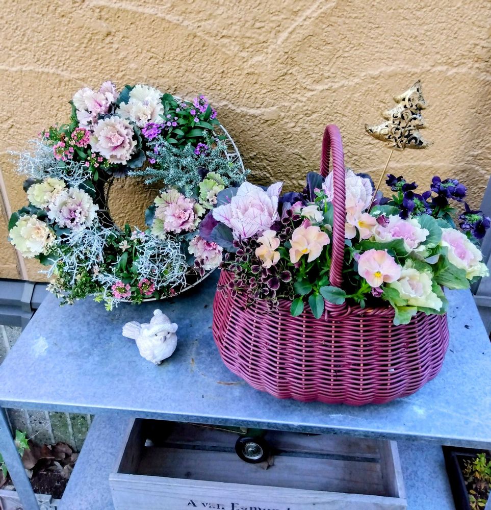 ピンクのカゴ🧺に寄せ植えもとても素敵ですね〜✨