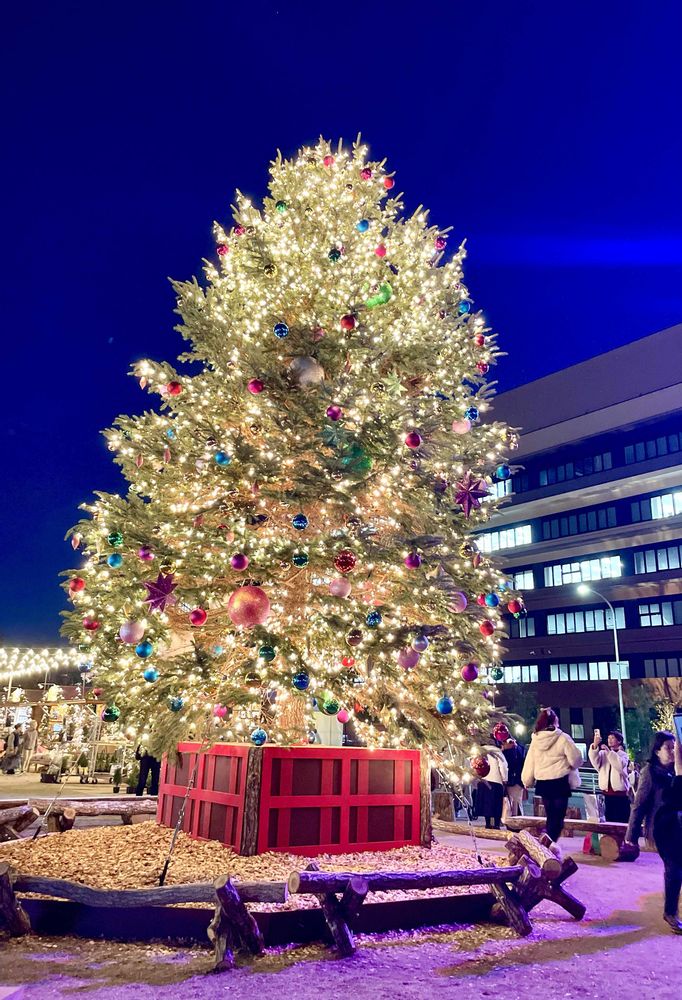 赤レンガのクリスマスマーケットで冬のキリッとした空気の中 黄昏時にぶらりとツリーを眺めながら ホットワインを飲むのが慌ただしい年末の私のホッとするお気に入りの時間だった。いつから入場料を取られ 1人ぶらりと言う雰囲気がなくなり寂しく思っていたのですが 気がついたら隣接する新港中央広場でも プチクリスマスマーケットをやってる!と言う事でホットワインを飲みながら大きなもみの木のツリーを楽しみました
