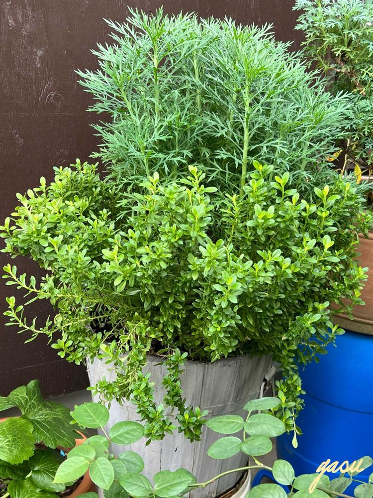 ソレミオ、フェリシア、アネモネ凛々花、ワスレナグサを40㎝くらいの木製樽鉢に寄せて、只今ソレミオとフェリシアが凄いことに🫢