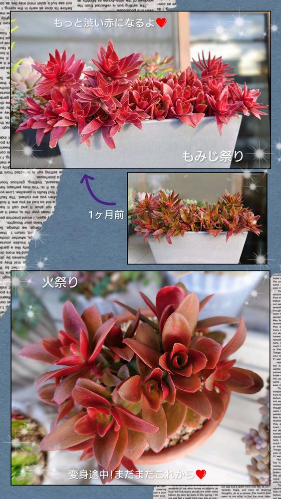 うちの子紅葉まつりも火祭りもこの夏の暑さで激減しとるよ〜😓 肥料が足りんかったかなぁ~❓🤔 ひっそり多肉カゴの中で紅葉🍁しとるけど… レディジアも真ん中みどりんのツートンカラーで頑張っとるけど… なんか盛り上がらん…😂💦 もう少し寒さが足りんのかなぁ~🤔🥶 これからの寒さに期待しよう…😅💦