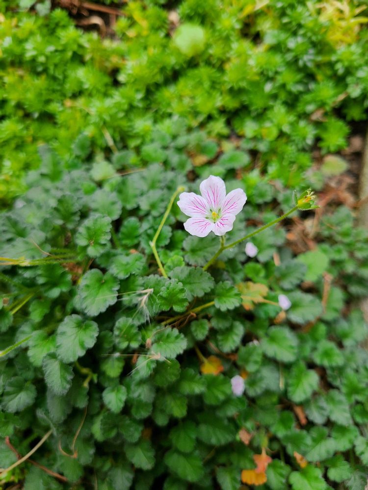 今朝、寒さの中、飛び石の脇にまだ元気に咲くヒメフウロソウ(姫風露草)を見つけました💠