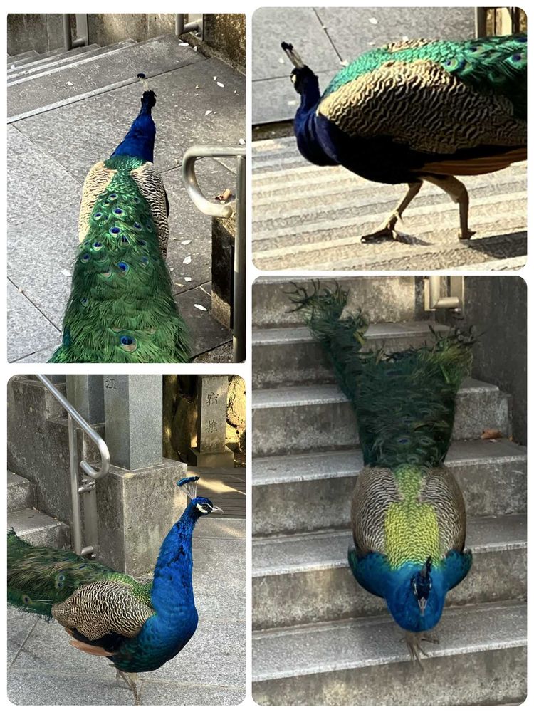 放し飼いの孔雀が階段を降りる姿を初めてみる 人馴れしているので私の横を通り抜け更に階段を降りる!