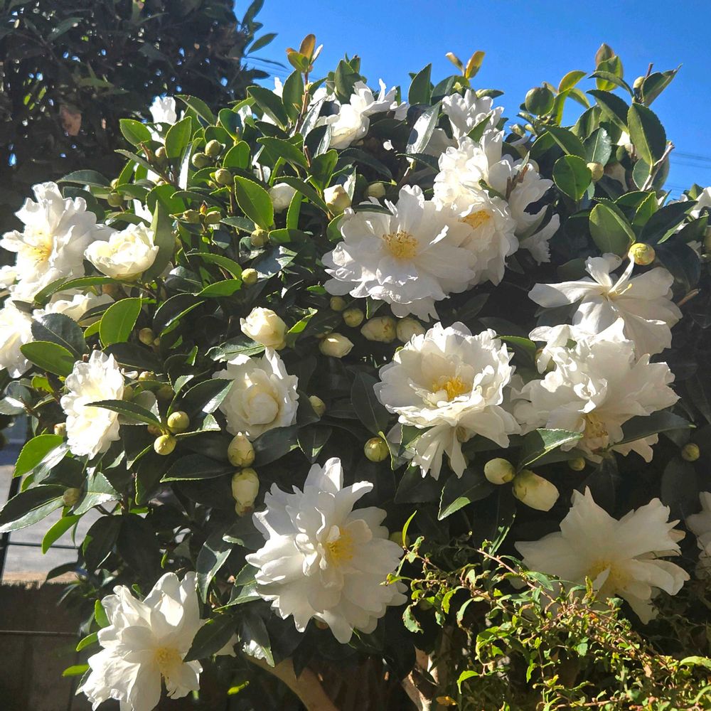 八重咲きのサザンカ、たくさんの花をつけたね。まだまだたくさんの蕾が見えて楽しみがつづくね🤍🤍💚🤍🤍💚🤍🤍