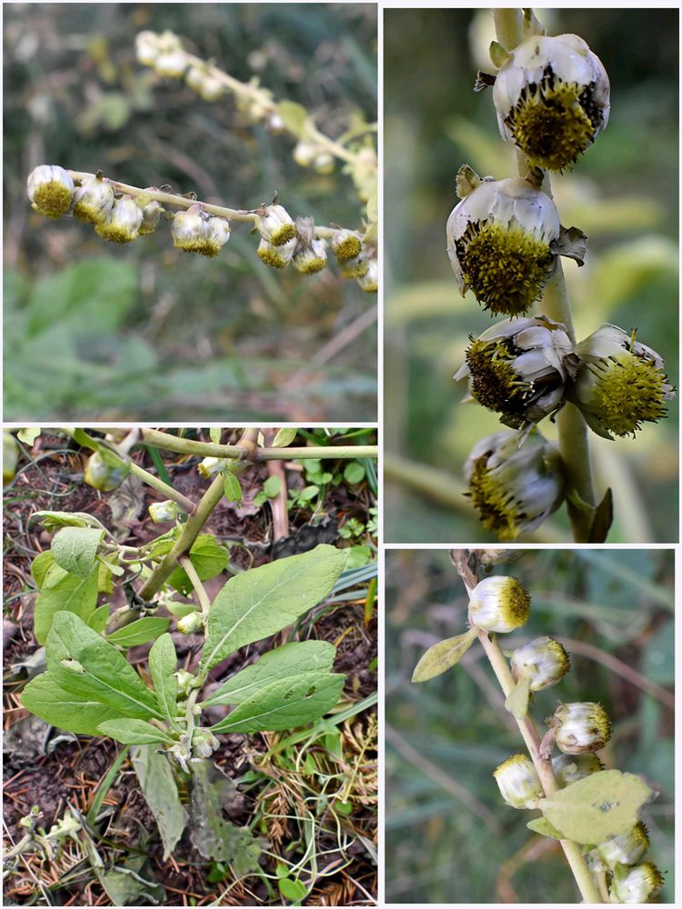 山地の沢沿いの林のふちや道端に生える。茎は太く、高さ1m前後になると、数本の横枝を放射状にのばす。根生葉と下部につく葉は長さ約25~30cm、幅約10~15cmの長い楕円形で薄く、両面に短い毛が生える。上につく葉ほど小さい。花は直径1cmの頭花で、葉の脇に一列に並ぶように下向きに咲く。色は黄色、中心部に筒状花が集まり、まわりに雌花がつく。
