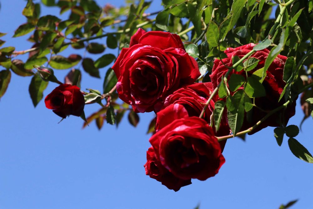 「ディープ インプレッション」は、名前の通り深紅の花弁が目を引くバラ🌹中輪 四季咲き。