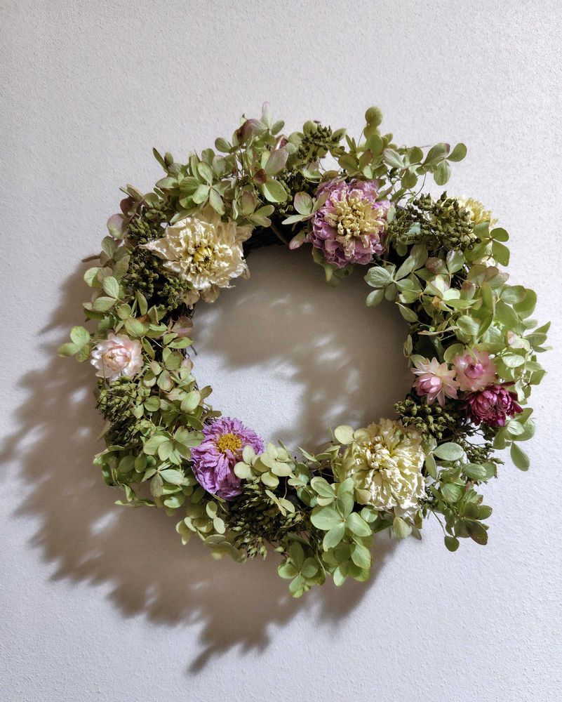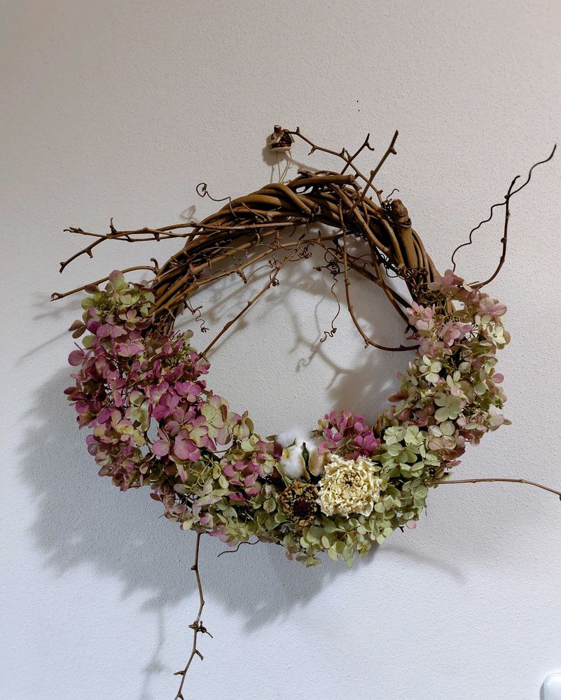 庭に咲いていたピラミッドアジサイ(ノリウツギ)のリースです。土台は何年も前に作ったものの再利用💕