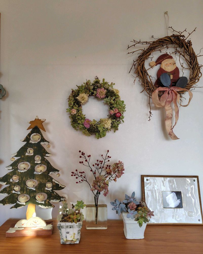 ③お花の少ない今、ドライや鉢植えで楽しんでいます。前の2鉢は多肉ちゃん🪴