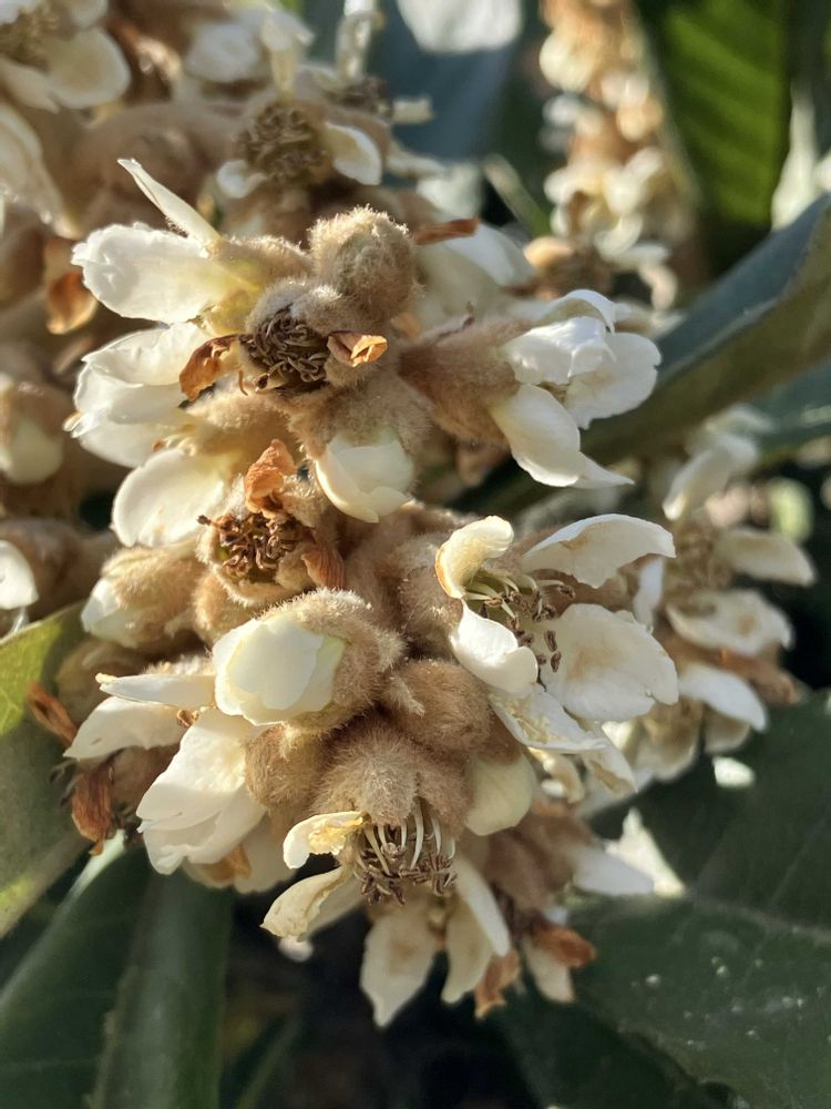 冬季に白い花を咲かせるビワはバニラに似た濃厚な香りが特徴です