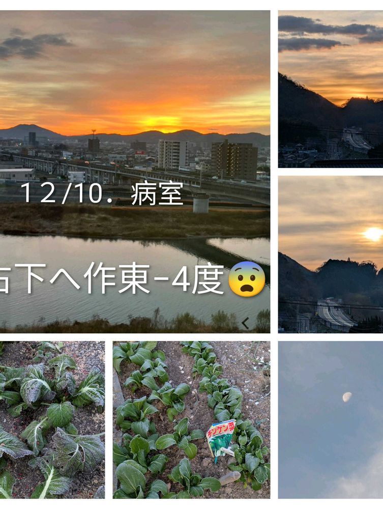 12/10.7:14~7:30.気温−4度の肌を刺す寒😨花も野菜達も🌱大霜の為カチカチだよ〜最後のコラージュは友人が入院中で部屋からの朝焼けの空picを頂いたので、コラージュしました🙏今日も一日宜しくです😊