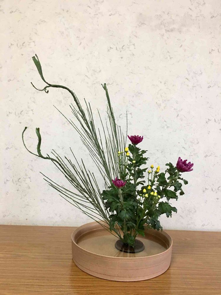 今回のお稽古🌼、未生流の基本形、個性盛花、斜型。