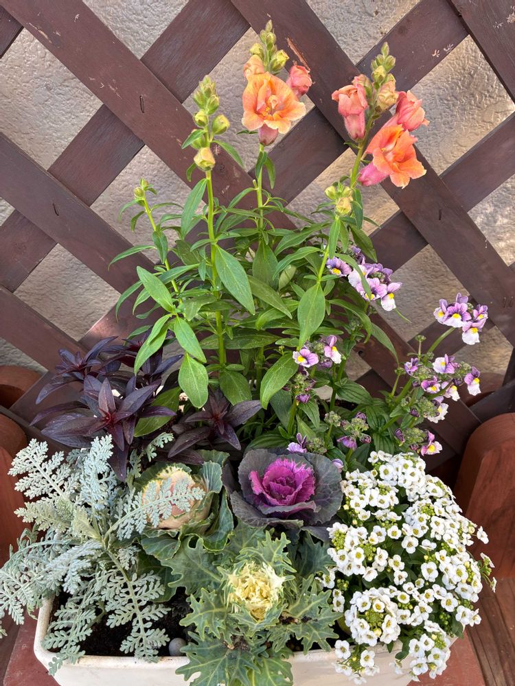オレンジ色の金魚草🧡が背が高過ぎですが、ご愛嬌🤣(格安苗だからネ🤭)