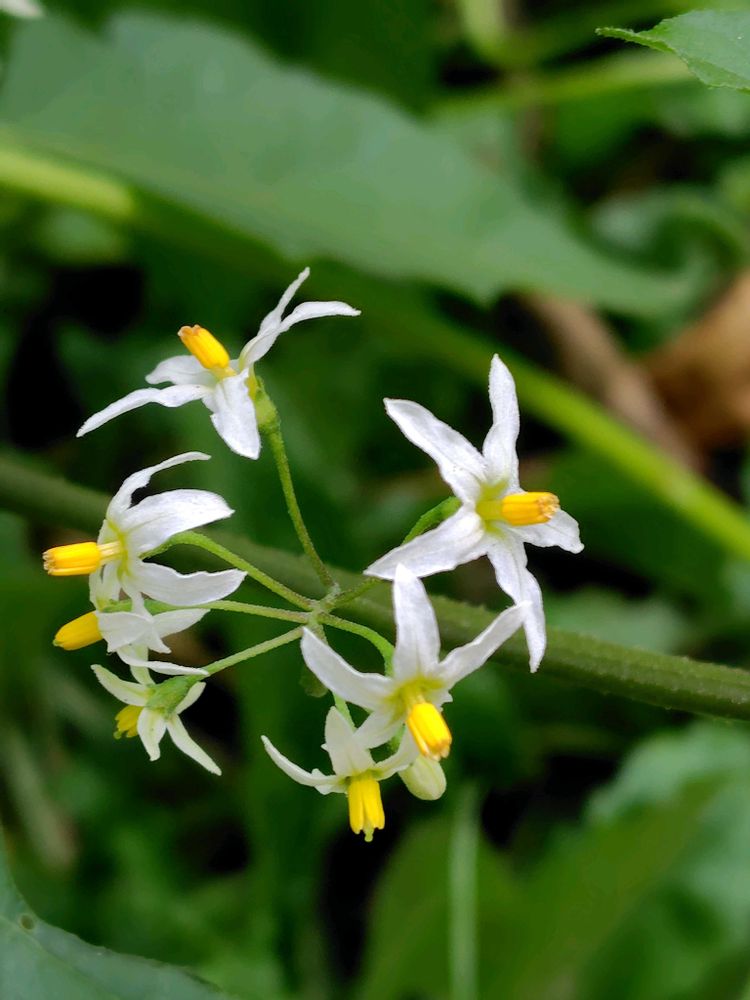 花はナスに似ており、花冠は径6〜7mmで白色。先が5裂して裂片の先が尖る。
