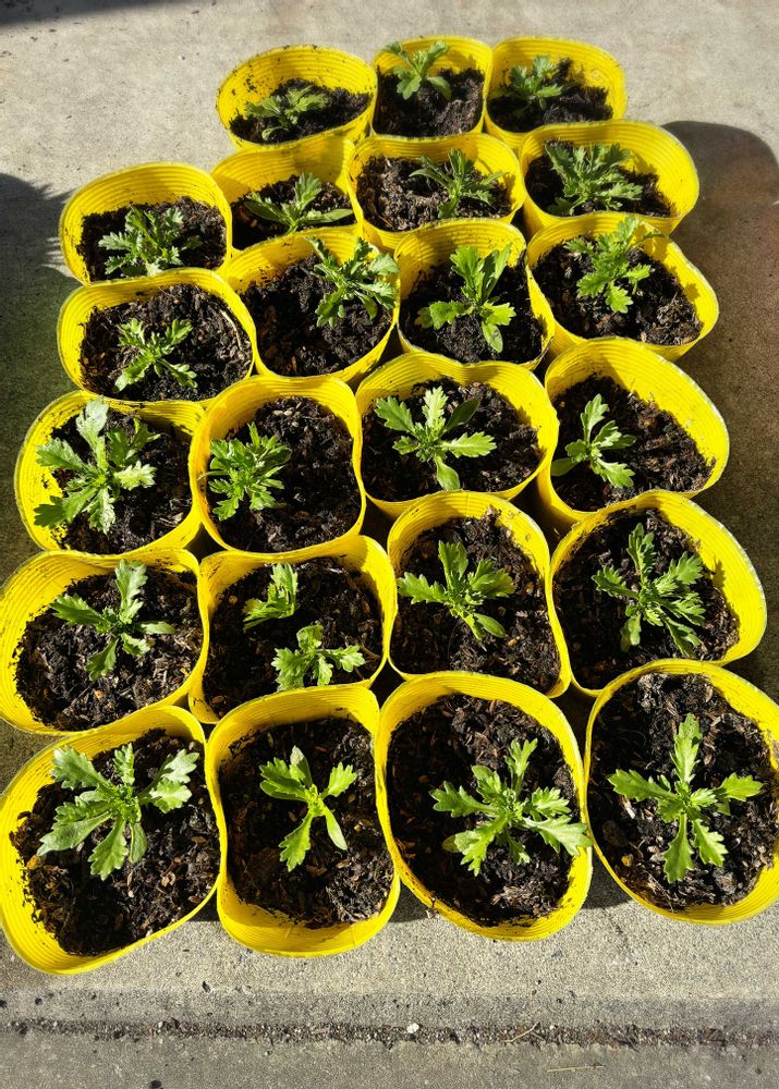 自家採取のタネでクリサンセマムもこんなに増えました。タネがどれなのかもわからないので枯れた花弁を揉み揉みしただけのタネまきでこんなにできちゃう。