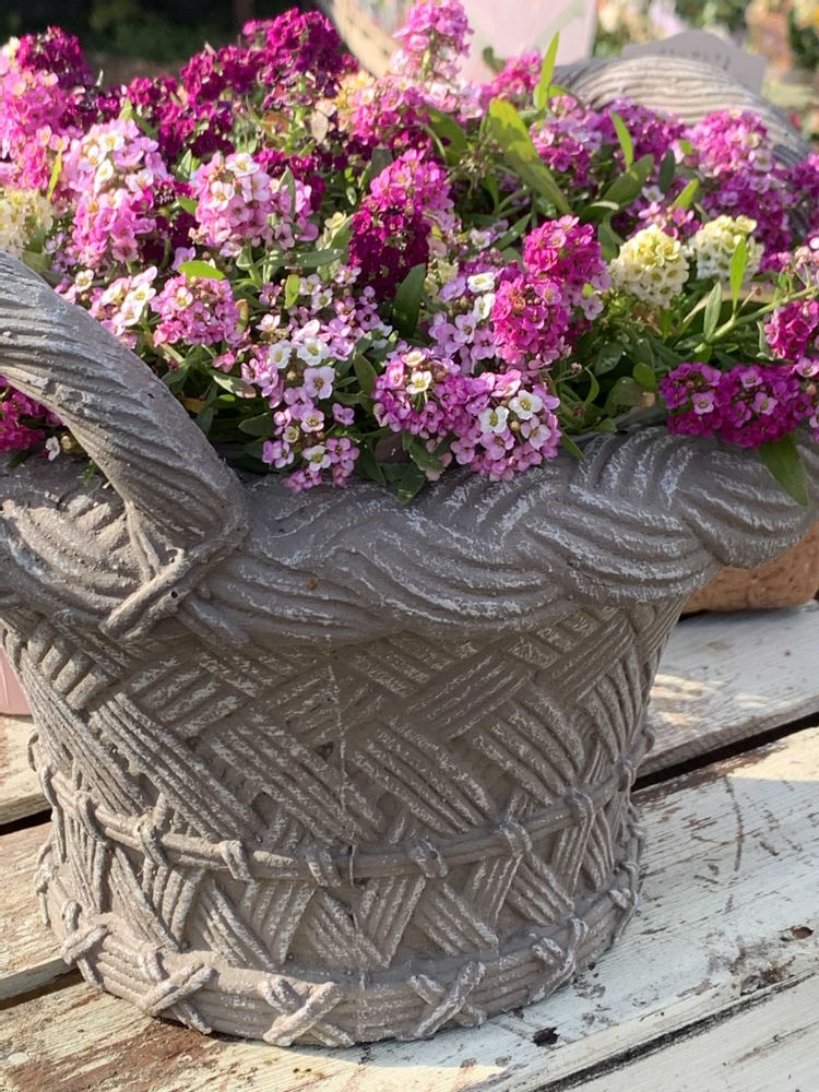 園芸やさんで🩷いろいろな色合いのアリッサムさんを陶器製の花カゴに🩷真似してみたいなと思いました