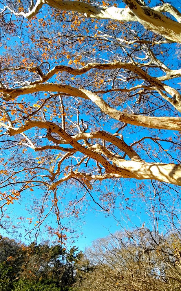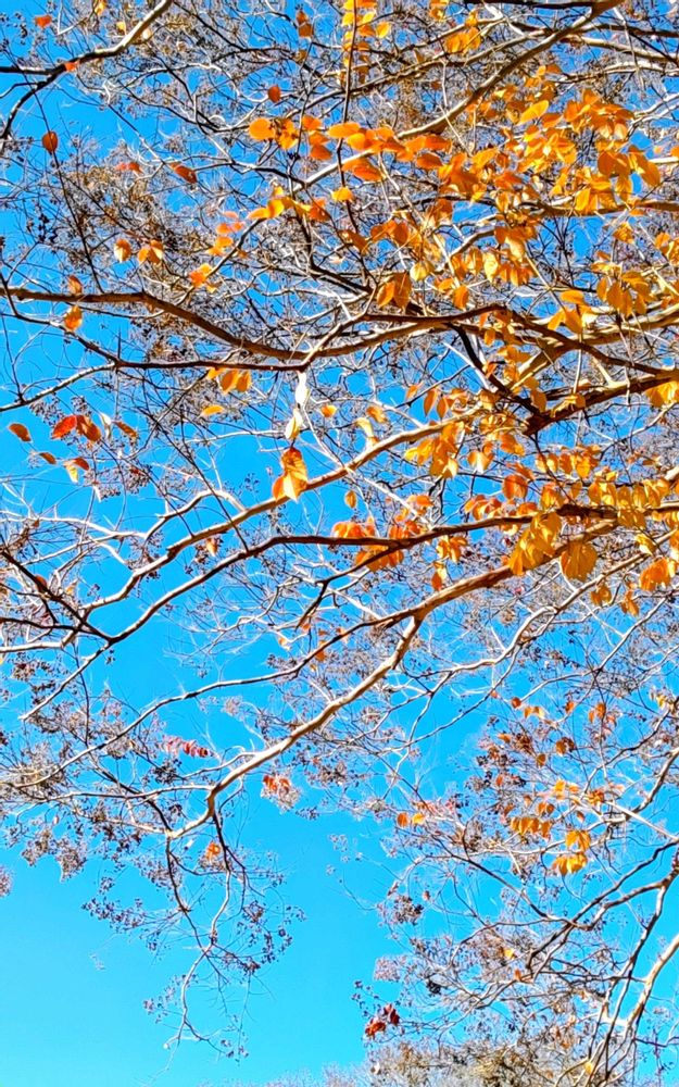 ステキな色の青空にシマサルスベリのオレンジ色がよく映えて素晴らしいですね。