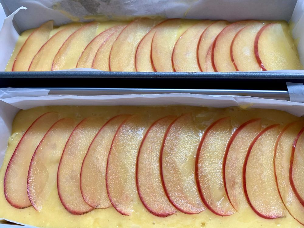薄くスライスしたりんごにグラニュー糖をまぶしてレンジでチンして生地の上に並べて焼きました