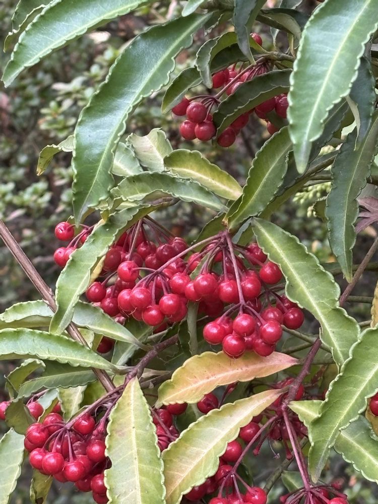 参拝の後、本殿の裏手にある「神嶽山神苑」(かんだけやましんえん)を見学しました。紅葉の見頃は過ぎていましたが、十両、千両、万両のツヤツヤした実に出会いました😊
