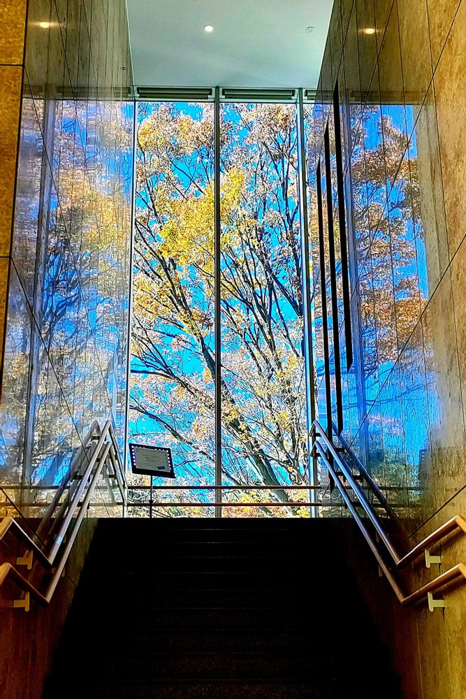 窓硝子と階段の壁に映り込んだ欅の美しさに「シェー😱💕」