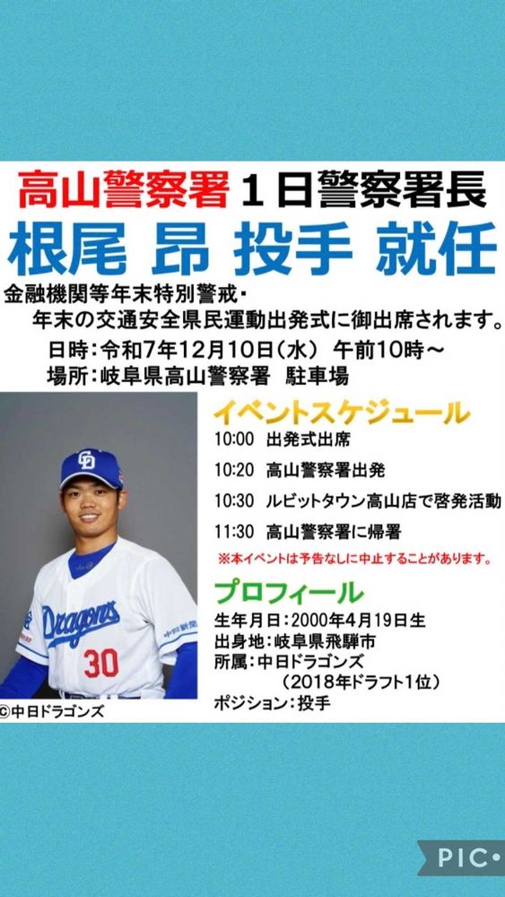 昨日は、中日ドラゴンズ⚾️出身の根尾昴選手が高山警察署の1日警察署長に任命され年末の交通安全を呼びかけました。根尾選手は、岐阜県吉城郡河合村(現:飛騨市)出身のプロ野球選手(投手)。右投左打。中日ドラゴンズ所属。中学時代は高山市のクラブでプレーし、大阪桐蔭高校時代に甲子園春夏連覇に貢献し2018年のドラフトでドラゴンズに入団しました。市内の商業施設を訪れ、詰めかけた大勢のファンや地域住民の声援に応じながら交通事故や特殊詐欺被害の防止などを呼びかけ、啓発チラシやグッズを手渡したり、年末の金融機関特別警戒と交通安全県民運動にあわせて行われたパトロールの出発式に参加しました。地元のファンを喜ばす地元のイベント貢献には賛成です🙋♀️来季は頑張って欲しいです、応援してます📣