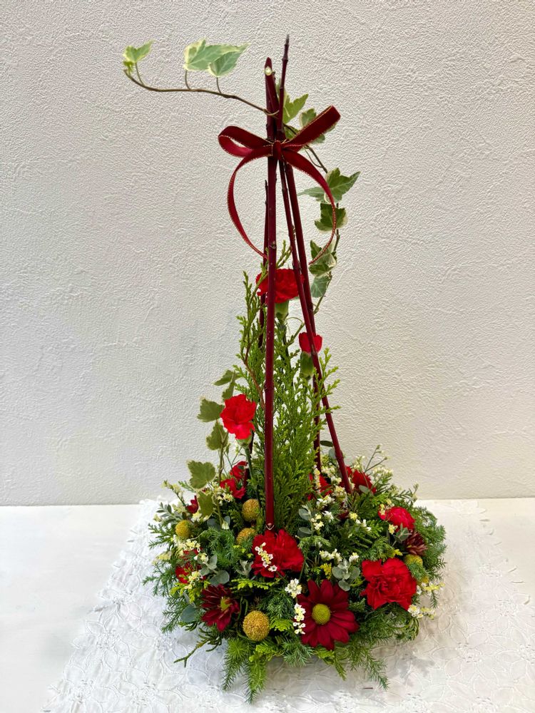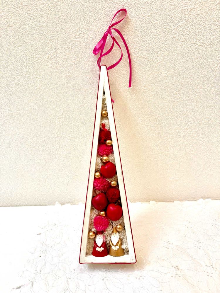 お花の教室ではこのような素敵なクリスマス飾りもやってくださるのですね✨トライアングルの形にブリザードフラワーや小物を詰め込んでオシャレな仕上がり〜🍎🎅