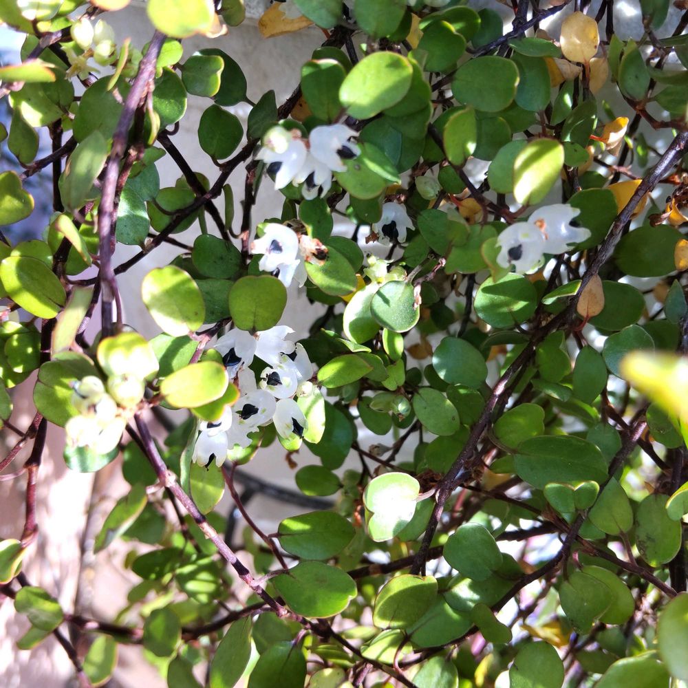 寄せ植えのワイヤープランツに、花が咲いてました。初めて見たのでビックリ🫨白い鈴みたあい😘🎁黄色パンジと、縦縞入りのビオラの寄せ植えに、我が物顔に成長しいたら、花つけるとは。嬉しい限り🙌