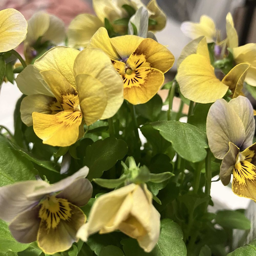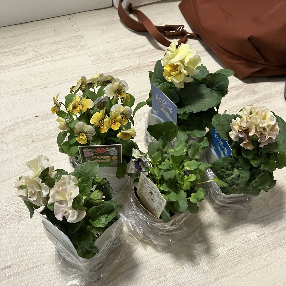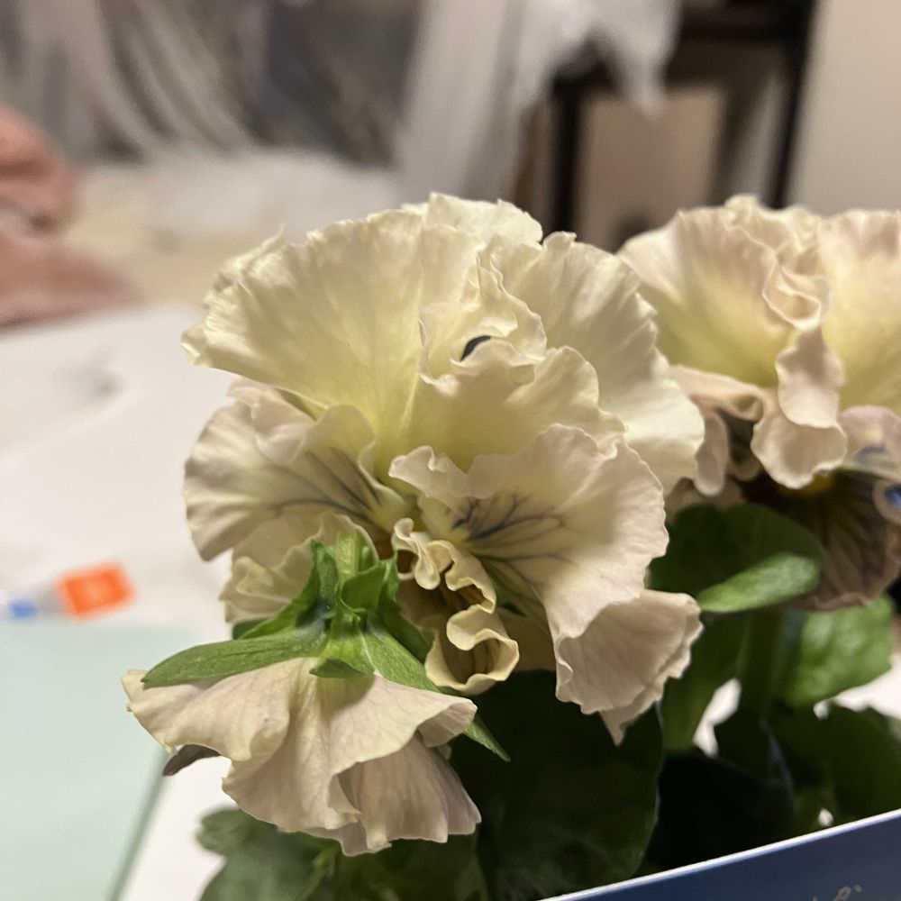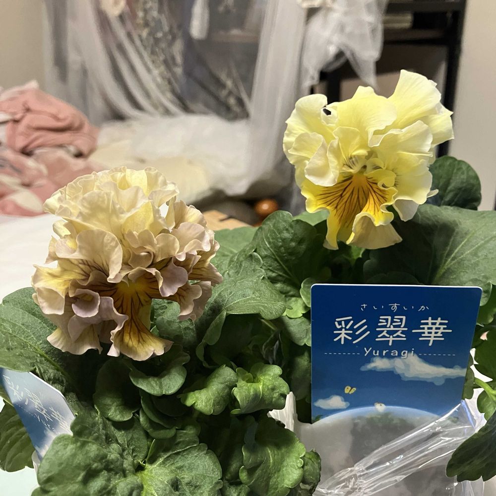 彩翠華のゆらぎ。ようやく三種揃いました。うちにしては珍しい大きな花のパンジー。二つとも華やかでいいです。