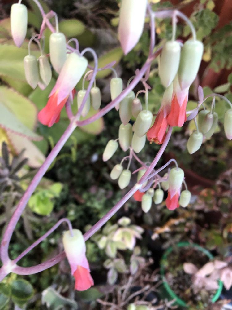 斑入りの多肉植物カランコエの一種で、冬から春にかけて釣鐘型の可愛い赤い花を咲かせ、ギザギザの葉が特徴で、斑入りの中でも育てやすく、短日植物なので冬の寒さに当てて外で育てると花が咲きやすい品種です。花はオレンジ~赤色のベル型で、株元から花茎を伸ばし、下向きに咲き、終わったら花がら摘みをすると良いでしょう。