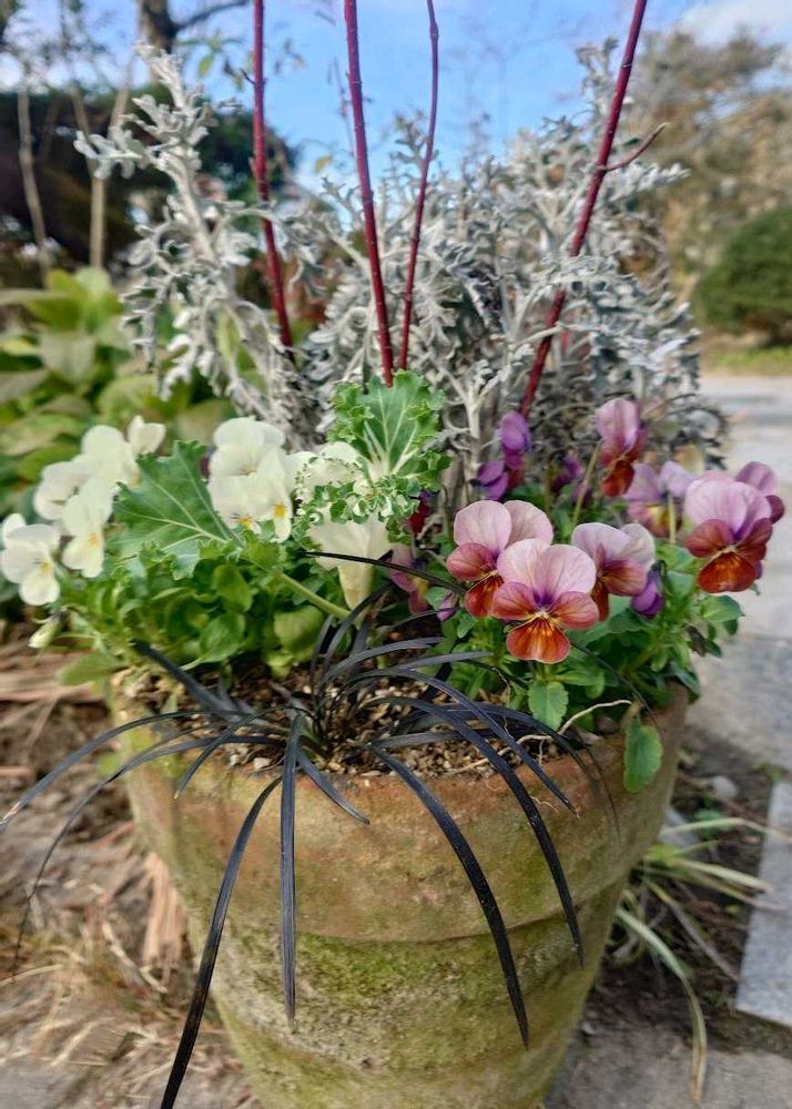 庭を片付けながら、パンジーと種から育てた葉牡丹を花壇や鉢植えのあちこちへ空いた時間にちょこちょこ植えていました