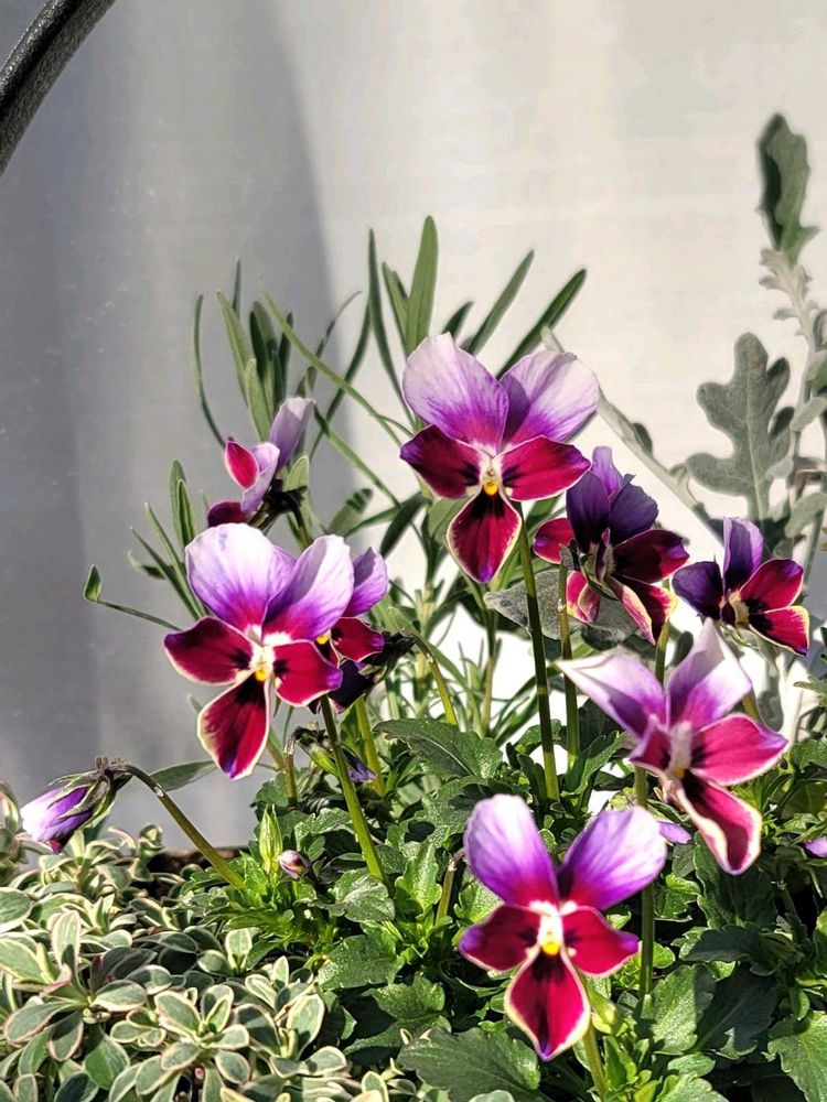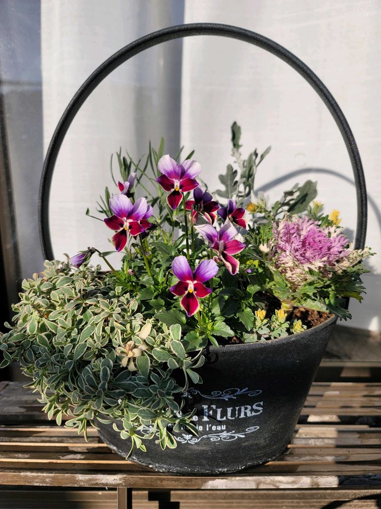 ✿モリモリのシレネとシロタエギクのバスケットに🧺ビオラ•ミステリアスバニーとレース葉牡丹を寄せ植えしました🪴