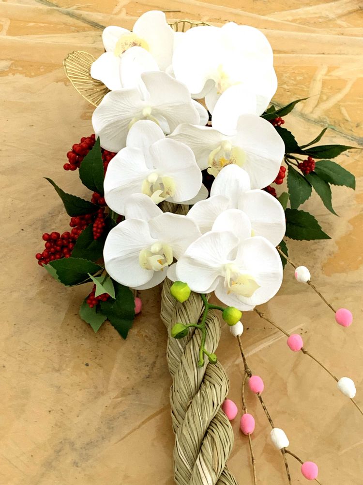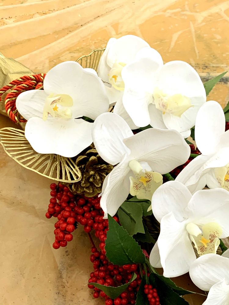 フェイクの胡蝶蘭・千両・南天・松ぼっくり・イチョウの葉・餅花・しめ縄・金色紙・飾りの紐・テープ巻きワイヤー10本